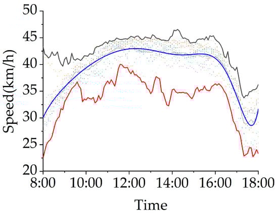 The real-time traffic speed data for Dalian were collected from the Baidu Maps Traffic Data Platform (https://jiaotong.baidu.com/congestion/city/urban, accessed on 10 April 2024) over a period of 14 working days starting from 10 April 2024, with a data collection interval of 5 min. The data were analyzed in 2024 and are plotted in Figure 3. In Figure 3, the black and red solid lines, from top to bottom, represent the maximum and minimum speeds observed at different time points over the 14 working days. The smooth blue curve represents the vehicle speed variation trend obtained through polynomial fitting. After comparison, a 9th-degree polynomial fit was selected, with an value of 0.9908. The polynomial function is given by Equation (3), where v(T) represents the velocity of the vehicle at time T.