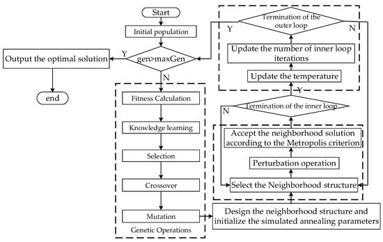The temperature is controlled using Equation (49) [], where represents the number of iterations, denotes the total number of outer loop iterations, represents the number of search iterations in the n-th inner loop, and and refer to the number of improved and accepted neighboring solutions in the n-th inner loop, respectively. Additionally, the number of inner loop iterations is adaptively adjusted using Equation (50) [], where [*] denotes the rounding operation.