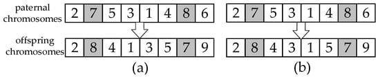 (b) Swap: Two customer points are randomly selected from the chromosome, and their positions are swapped to generate a new chromosome.