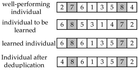 In this paper, a historical archive set is established to record the well-performing individuals during the iteration process, allowing their superior genetic information to be utilized in subsequent evolution. The decision of whether an individual needs to learn is based on a learning probability. The learning procedure is illustrated in Figure 7. First, a well-performing individual is randomly selected from the historical archive. Then, two genes , are randomly chosen, and a learning segment is determined. The genes in the learning segment are replaced with the corresponding segments from the superior individual. The deduplication operation is performed at the end to obtain the final individual.