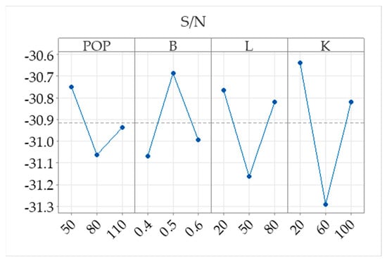 The self-learning mechanism is employed to dynamically adjust parameters through population evolution information. However, the initial values of key parameters are determined using the Taguchi method, such as population size , base learning rate , initial inner-loop iterations , and outer-loop iterations . Taking example C10, each parameter is set to three levels: 50, 80, and 110 for population size; 0.4, 0.5, and 0.6 for base learning rate; 20, 50, and 80 for initial inner-loop iterations; and 20, 60, and 100 for outer-loop iterations. An orthogonal array L27 is used for the analysis of the four parameters with three levels in Minitab 22 software. The Taguchi method is one of the main tools used for this, and since the objective is minimization, the small-type Taguchi method is applied to identify the best parameter combination for achieving the minimum. The results, as shown in Figure 8, indicate that the optimal parameter combination is 80, 0.4, 50, and 60. The remaining parameters are set as follows: are set to 0.4, 0.8, 0.03, 0.08, and 1000, respectively.