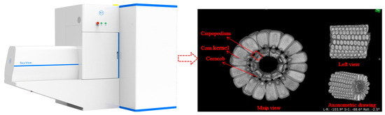 To explore the connection between the carpopodium and the corn cob, the SkyView400 series CT scanning imaging system produced by Guangzhou Boluteng Biotechnology Co., Ltd. (Guangzhou, China) was used to scan the carpopodium. The main parameters were as follows: The grayscale value was 16 bit; there were 4.2 million pixels (2048 × 2048); the pixel size was 13.5 the X-ray detector type was CMOS; the voltage was 70 kv; and the maximum output power of the X-ray light source was 45 w.