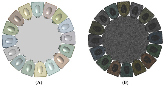 In the simulation analysis, the contact between the corn kernel and the corn cob used automatic surface contact. In the connection structure system, spot welding could connect components. In this study, spot welding was used to simulate the connection between the carpopodium of the corn kernel and the corn cob. Since the connection between the carpopodium and the corn cob was rectangular, the contact surface between the carpopodium and the corn cob of each group of corn kernels used four groups of nodes to set spot welding and, at the same time, ensure that the nodes between the carpopodium of the corn kernels in adjacent, alternating, and opposite rows did not coincide to avoid the repetition of spot welding. Since the nodes were rigid and massless, no constraints were imposed on the solder joints, as shown in Figure 5A.