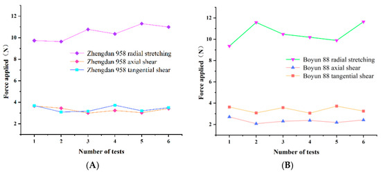 It was found that the axial shear and tangential shear fracture forces were approximately equal, and both were smaller than the radial tensile forces. The main reason was that radial stretching resulted in a uniform fracture at the interface of the carpopodium, which requires a relatively strong force during fracture; while, when axial and tangential shear forces were applied, the carpopodium was easy to fracture, and the required fracture force was small. The axial and tangential forces applied in the actual process of kernel threshing were more conducive to carpopodium fracture and achieved kernel threshing, as shown in Figure 6A,B.