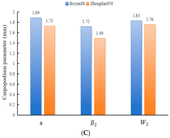 Through the measurement of the carpopodium parameters, it was found that the a, B, and W values of Boyun 88 and Zhengdan 958 had little difference, mainly because the cone-shaped wooden connection between the carpopodium and the corn cob of the corn kernel was small, and the size difference was small. Therefore, simulation could be conducted through the connection between the carpopodium and the corn cob. The carpopodium parameter analysis is shown in Figure 6C.