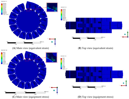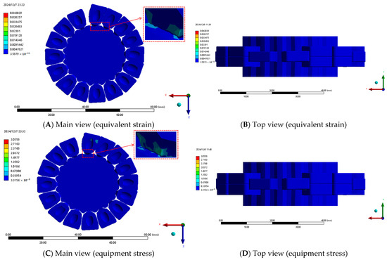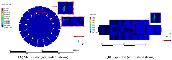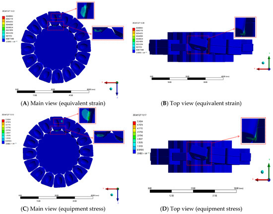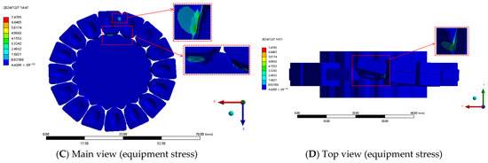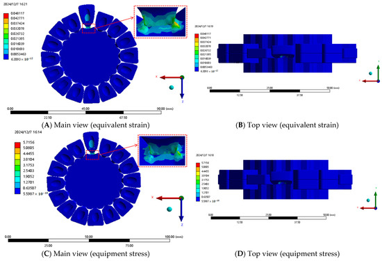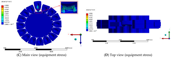 The carpopodium fracture force of Zhengdan 958 was , and, according to the above calculation method, the stress generated by the carpopodium fracture was then, the average stress value of each solder joint was 0.261 . The maximum equivalent stress value occurred at the contact point of the dislocation of corn kernels. This is because when the corn kernel is inclined under force, it squeezes the surrounding corn kernels and has a large extrusion pressure. By inserting a probe into the solder joint, the maximum stress value was 3.31 MPa, more significant than the average stress value of the solder joint between the carpopodium and the corn cob. The simulation results are shown in Figure 8.