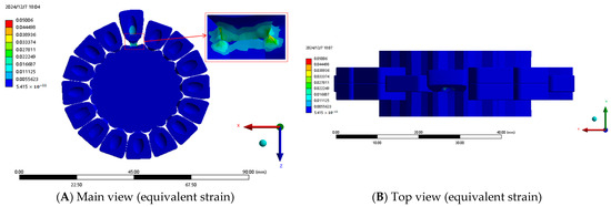 According to the above methods, the fracture force for the Zhengdan 958 carpopodium was 10.46 the stress generated by the fracture of the carpopodium was ε = 3.32 and the average stress value of each solder joint was 0.83 . The maximum fracture stress value of the solder joint measured by the probe was 2.76 . The simulation results are shown in Figure 10.