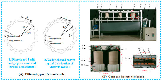 The conveying device was composed of two sets of transmission chains. According to the diameter of the corn ear, the distance of the two sets of transmission chains was 20 mm; was 63 mm, and was 60 mm. A corn ear guide device was installed between each set of threshing rollers. The conveying device and the flexible discrete device were powered by the motor and connected to the frequency converter to ensure the speed independence and adjustability of the two. The corn ear discrete test bench is shown in Figure 13B.