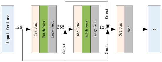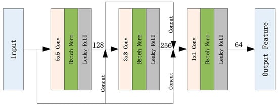 In this paper, the PNN architecture is used as the extraction module, which is originally used for image super-resolution [36], as shown in Figure 2. Compared to residual networks, PNN is characterized by its simplicity and ease of training. The extraction module consists of three convolutional layers. The filter sizes for these layers are 5 × 5, 3 × 3, and 1 × 1. The stride is set to 1 with padding, and the numbers of extracted feature maps in each layer are set to 128, 256 and 64, respectively. Furthermore, the PNN architecture is enhanced by incorporating skip connections, which are inspired by dense networks. The skip connections facilitate the transmission of more intricate information to the succeeding layers, enabling the network to fully exploit valuable information and train quickly.