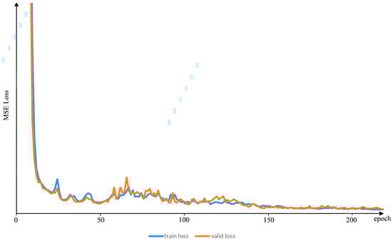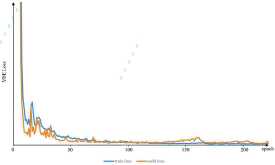 Our research employs a random selection process to choose 1600 × 1600 × 112 components from the Chikusei dataset in order to assess the efficacy of IFNPMH. We divided the chosen images into 100 smaller images, each measuring 160 × 160 × 112. In the comparative experiment of Chikusei dataser, the training data pairs for HSI, MSI, and PAN were input with dimensions of 40 × 40 × 112, 80 × 80 × 4, and 160 × 160 × 1, respectively. The Chikusei data comparison experiments consisted of 100 pairings in total. The first 80 pairs are designated as the training dataset, the next 10 pairs are utilized as the validation dataset, and the last 10 pairs are assigned to the testing dataset. The train loss and valid loss during the training process are shown in Figure 5.