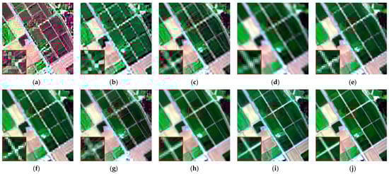 Visual comparison of fusion results on the simulated Chikusei data set: (a) PC, (b) GLP, (c) Hysure, (d) FUSE, (e) MAPSMM, (f) SFIMHS, (g) HyperPNN, (h) HMPCNMF, (i) IFNPMH, (j) HHSI. (The red box represents a partially enlarged area in the image, in order to better display the details in the image).