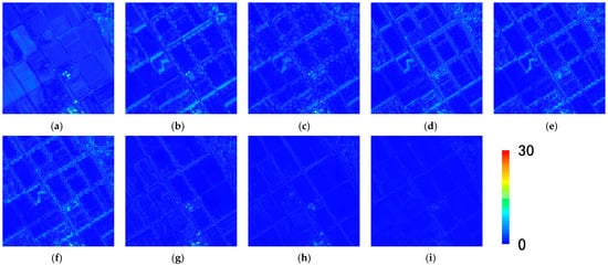 Figure 9 displays a visual comparison of the various approaches using the Houston data. The reference image is denoted by HHSI. We chose the 24th, 10th, and 5th bands in order to produce color images. According to Figure 9a, PC exhibits greater spectrum distortion compared to other approaches, and the total disparity between PC and the original image is greater. In Figure 9, it can be observed that FUSE, MAPSMM, and SFIMHS lack spatial smoothness and have coarse spatial details. Conversely, HyperPNN, HMPCNMF, and IFNPMH display distinct spatial details, although there is some spectral distortion. Notably, IFNPMH in Figure 9 exhibits clear spatial details with minimal spectral distortion. When comparing the 8 images in Figure 9, it can be shown that IFNPMH is the most similar to the reference image and produces the best fusion result, thus demonstrating the efficiency of IFNPMH. For instance, in the magnified section of Figure 9, the larger portion of IFNPMH demonstrates a notable superiority compared to other methodologies. This conclusion can be confirmed by examining the residual images and calculating the mean absolute errors between the fusion results and the reference image, as depicted in Figure 10. The residual values of HyperPNN, HMPCNMF, and IFNPMH are comparatively lower than those of other methods, with IFNPMH exhibiting the highest performance. This further validates the effectiveness of IFNPMH.