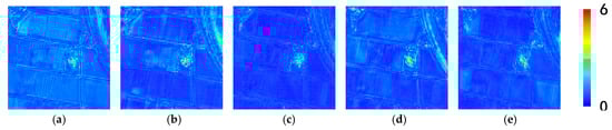 This paper performs ablation tests on the simulated Chikusei dataset to examine the influence of the value in the loss function on the training of IFNPMH networks. The values of chosen for this article are 0, 3, 5, 8, and 10. When is equal to 0, the loss function solely consists of Lspectral and does not take Lspatial into account. The outcome of the fusion is depicted in Figure 11. In visual comparison, the fusion result is most distorted when the value of is 0. The rest of the fusion results are very superior, and the difference with the real image is not obvious. This demonstrates the efficacy of incorporating Lspatial. Figure 12 displays the residual map, which represents the difference between the fused image and the true image, for varying values of . By analyzing the residual map, we observed that the difference between the fused result and the reference image is greatest when is equal to 0. This finding further validates the usefulness of incorporating Lspatial. When the value of is set to 5, the fusion result is found to be the most similar to the reference image, thus demonstrating that = 5 is superior than other values.