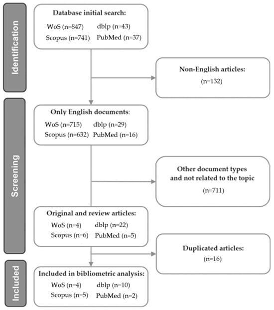 The study followed the detailed elements of the PRISMA 2020 guidelines for bibliographic reviews, focusing on key aspects such as the rationale (item 3), objectives (item 4), eligibility criteria (item 5), information sources (item 6), search strategy (item 7), selection process (item 8), data collection process (item 9), synthesis methods (item 13a), synthesis results (item 20b), and discussion (item 23a) (for more see Partial PRISMA 2020 Checklist in Supplementary Materials). The bibliometric analysis used tools available in the Web of Science (WoS), Scopus, dblp, and PubMed databases. This methodological approach facilitates bibliometric and scientometric studies by enabling a detailed categorization by concepts, research fields, authors, documents, and sources. The results are presented in a table that supports flexible analysis and visualization. Considering the interdisciplinary nature and complexity of the topic, the key results of the review are summarized in a comprehensive table for clarity.