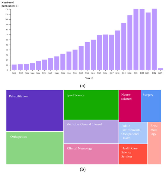 The summary of the bibliographic analysis results is presented in Table 3 and Figure 2a,b. The review included 21 articles (2001–2025) [31,32,33,34,35,36,37,38,39,40,41,42,43,44,45,46,47,48,49,50,51,52] published in the last 25 years (no older ones were included). The large number of articles that were excluded from the review is due to the fact that they belonged to other medical disciplines, and the articles only mentioned rehabilitation and/or physiotherapy, as well as articles that did not address the issue of clinical applications, but only their remote possibilities (in terms of time, costs, or implementation).