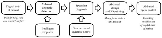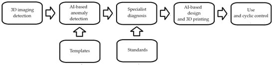Future research on integrating AI–AM systems for personalized rehabilitation and physical therapy should focus on improving data collection and processing techniques. The challenges and limitations observed may be mitigated by the expected advances resulting from the widespread use of digital twins for the real-time simulation and personalization of rehabilitation devices prior to production, as well as virtual reality and augmented reality tools for creating immersive, patient-specific training environments with physical aids. Collaborative platforms based on edge computing and federated learning can accelerate response to the deviations from the rules and the implementation of improvements and innovations, including quality and material recycling. The patients and the sustainability at the center fit perfectly into the paradigm of Industry 5.0, of which we are witnessing the implementation.