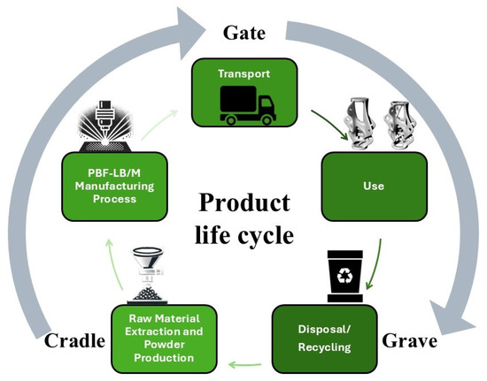 Together, LCA, the circular economy, and eco-design form a holistic framework that drives sustainable practices in AM processes. The circular economy provides an essential framework for minimizing waste and maximizing resource use by maintaining materials, products, and components in continuous cycles. Unlike the linear “take, make, dispose” model, the circular economy aims to “close the loop”, enhancing resource productivity and reducing reliance on virgin materials. This approach emphasizes recycling, repurposing, and remanufacturing and supports sustainable production and consumption. Metals are particularly well-suited for advancing a circular economy, owing to their superior recyclability and potential for repeated reuse without significant degradation. In PBF-LB/M, circular economy principles align closely with manufacturing needs, as they support the recovery, recycling, and reuse of metal powders. Unused or excess powder can be collected, refined, and reintegrated into production, creating closed-loop systems and promoting sustainable resource management [10,36]. Eco-design has emerged as a strategic approach to embedding sustainability at the design stage, maximizing environmental benefits early in product development. In PBF-LB/M, eco-design leverages the flexibility of technology design to create more sustainable components. The layer-by-layer fabrication inherent in PBF-LB/M enables complex geometries that conserve material without compromising performance, advancing eco-design objectives and reinforcing the shift toward sustainable manufacturing practices.