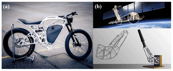 While the initial design phase, computational simulations, and extended production times may lead to higher upfront costs, these can be offset by long-term benefits such as material savings, improved efficiency, and enhanced performance throughout the component lifecycle. In fact, this approach aids in overcoming design challenges, particularly in creating lightweight components for many industrial fields such as automotive and aerospace. Several case studies on the TO of aerospace components, such as the connector support of the VEGA space launcher, a typical lever component from civil aircraft, a housing part from fan cowl structures, and a jet engine bracket, demonstrate mass reductions ranging from 20 to 60% [116,117]. Also, several case studies on the topology optimization of automotive components have shown significant improvements. For example, brake calipers achieved a 41.6% mass reduction, the steering upright became 9% lighter than the reference component, and the optimized automotive knuckle part exhibited a stiffness increase of more than 2.5 times compared to the original design [118,119,120]. Furthermore, this approach is particularly appreciated when combined with the use of lightweight, high-performance alloys. To cite an outstanding example, APWorks has developed the world first 3D-printed motorcycle utilizing PBF-LB/M technology and the patented Scalmalloy® material [121]. This innovative creation, illustrated in Figure 6a, known as the Light Rider, stands out as an exceptionally lightweight model, weighing just 35 kg [46]. Its 6 kW electric motor propels it from zero to 80 km/h within seconds, demonstrating impressive acceleration. The motorcycle frame, a mere 6 kg, contributes to its remarkable 30% weight reduction compared to conventionally manufactured e-motorcycles. APWorks employed an algorithm to design the Light Rider’s optimized structure, achieving a minimal weight while ensuring frame robustness to endure everyday driving demands and stresses. RUAG Space has developed an optimized antenna bracket, measuring 40 cm in length, for Sentinel satellites using PBF-LB/M with AlSi10Mg (Figure 6b). Engineers redesigned and optimized this part using Altair ProductDesign which is SIMP-based software 2023, followed by production utilizing an EOS M400 machine. By enhancing the structural design, they achieved a stiffness increase of over 30% above the minimum requirement while reducing the weight from 1.60 to 0.94 g. This improvement represents a substantial performance enhancement along with a weight reduction exceeding 40% compared to the conventionally manufactured component [122,123].