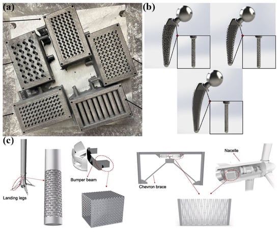 Employing lattice structures facilitates component lightweighting, effectively reducing part weight while preserving structural integrity. Latticing provides the means to decrease solid mass without compromising performance. Additionally, lattices can be fine-tuned to construct high-energy or shock-absorption structures. For instance, auxetic lattice structures, characterized by their negative Poisson ratio, exhibit excellent behavior in energy absorption and damping. Moreover, lattice structures inherently offer a large surface area, making them ideal for heat transfer and particularly advantageous for thermal management and heat exchanger applications [127]. Figure 7 depicts various applications of lattice structures, including heat exchangers (a), orthopedic implants (b), and vibration isolation (c).
