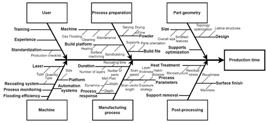 Ishikawa diagram illustrating the factors that impact production time in the PBF-LB/M process [149].