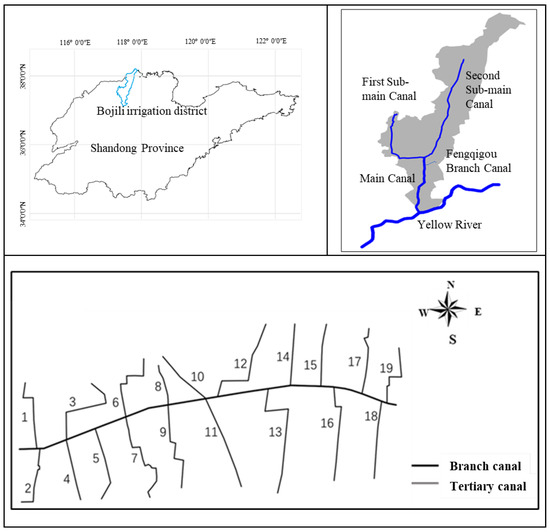 The Bojili Irrigation District is located in the western part of Binzhou City, Shandong Province, and encompasses Huimin County, Yangxin County, and Wudi County. The geographical coordinates of the irrigation district are 117°14′37″–117°58′44″ E and 37°07′41″–38°14′57″ N. The irrigation area of the district covers 60,000 hectares, making it one of the 434 large irrigation districts in China. The Fengqigou branch canal and its tertiary canals were selected as the research focus for this study. Basic information about the canal is provided in Table 1, and a schematic diagram of the canal location is shown in Figure 3. This study selects the first irrigation during the wheat spring irrigation period in the irrigation district as the object of water distribution timing research. The gross irrigation quota (crop water requirement) for wheat in this irrigation event is 540 cubic meters per hectare, which is based on the calculated results from many years of experience in the irrigation district. The irrigation quota is calculated using the field water balance method, where the irrigation quota equals the crop water requirement minus effective rainfall, soil water storage, and groundwater replenishment [28].