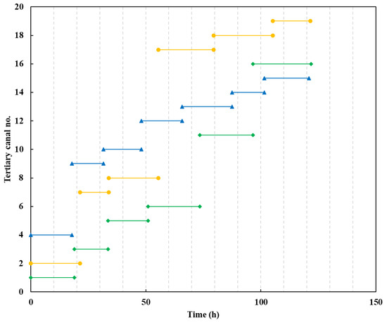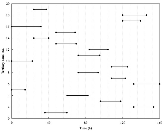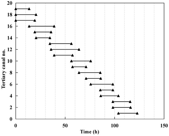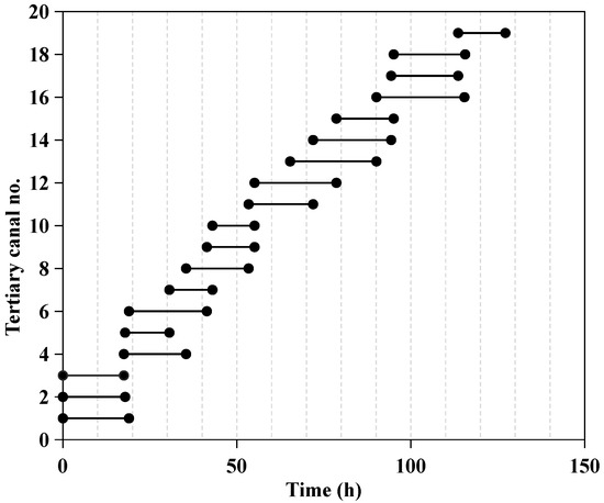 Figure 4 and Figure 5 show the start and end times of water distribution for each tertiary canal in Irrigation Model 1 and Irrigation Model 2, respectively. These two models follow an upstream-to-downstream sequence for the tertiary canals. When the water distribution of the upstream tertiary canal is completed and the flow rate in the branch canal meets the flow rate requirement of the next tertiary canal, the next canal begins its water distribution. During the water distribution process, water will not bypass an upstream canal to be distributed to a downstream canal. These two types of irrigation model are still widely used in major irrigation districts due to their simplicity and lack of complex logical relationships. The total water distribution times for Irrigation Model 1 and Irrigation Model 2 are 127.19 h and 122.84 h, respectively.