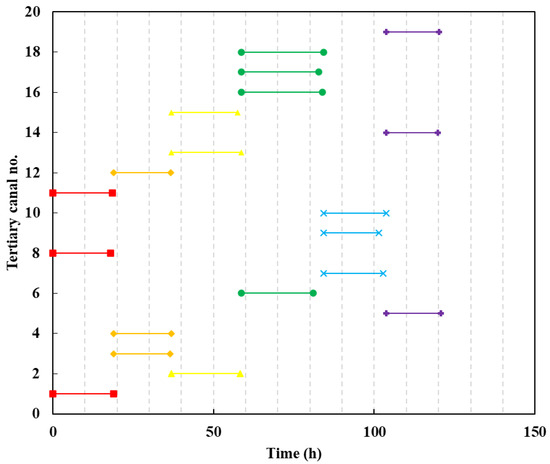 Figure 7 shows the start and end times of water distribution for each tertiary canal in Irrigation Model 4. In this model, canals are irrigated rotationally between groups, while canals within the same group are irrigated simultaneously. The model divides 19 tertiary canals into six groups, as shown in Table 4. The water distribution duration for each group is determined by the canal with the longest distribution duration within that group. The irrigation durations for each group, from Group 1 to Group 6, are 18.99 h, 17.88 h, 21.71 h, 25.69 h, 19.54 h, and 16.98 h, respectively. The total duration for all canals is the sum of the durations for the six groups, which is 120.79 h. The differences in irrigation durations for canals within the same group are minimal. If the difference is small enough, as determined by a rational optimization model, the manager can operate the gates of the canals simultaneously, making canal management more convenient.