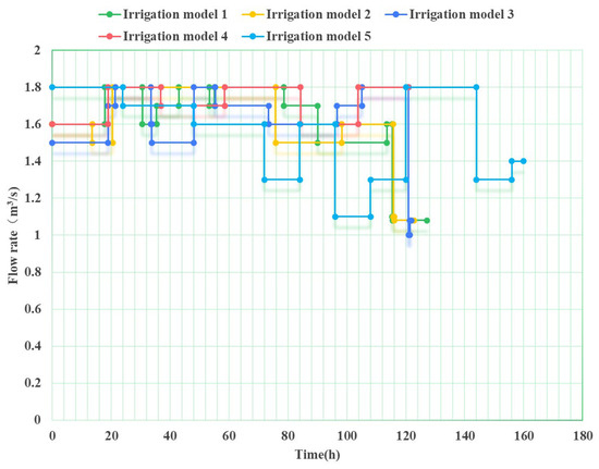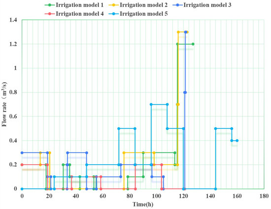 The total duration of water distribution is a key index in irrigation management. During the water distribution process, managers aim to develop a scheme with the shortest total duration. The total water distribution times for the five models are 127.19 h, 122.84 h, 121.91 h, 120.79 h, and 159.98 h, respectively. Irrigation Model 4 has the shortest total water distribution time, while Irrigation Model 5 has the longest. The total duration of water distribution is similar in Models 1 through 4, with minimal differences being exhibited.