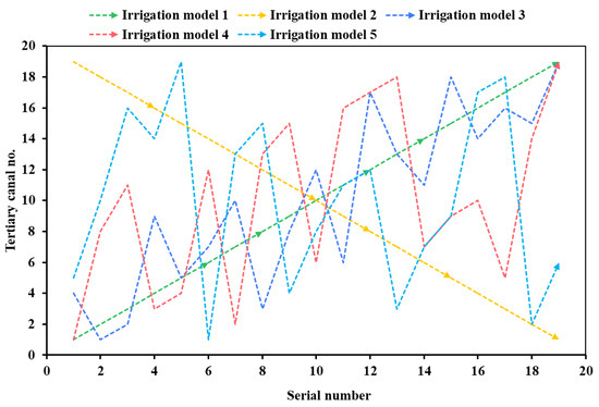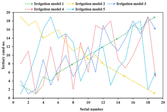 Operability for managers primarily concerns the sequence of opening and closing gates, whether from upstream to downstream or vice versa, during the water distribution process. Figure 10 shows the opening sequence of the tertiary canals in the five models. A greater fluctuation in the gate-opening curve indicates more operational complexity for the manager. In Irrigation Model 1, each gate is opened sequentially from Canal 1 to Canal 19, and the downstream canal gates will not be opened before the upstream gates. Similarly, in Irrigation Model 2, the gates are opened one by one, but in reverse order, from Canal 19 to Canal 1. In Irrigation Model 3, all canals are divided into three groups, and in Irrigation Model 4, they are divided into six groups. This type of distribution model leads to grouping of canals with long distances between upstream and downstream, causing the gate-opening sequence curves to fluctuate more widely. Irrigation Model 5 exhibits the most significant fluctuations in the curves, indicating that managers need to travel frequently between upstream and downstream sections of the branch canal to open the gates. Figure 11 shows the closing sequences of the tertiary canals in the five models. Due to variations in the duration of each canal’s water distribution, the order in which the gates are closed differs from the opening order. In Irrigation Models 1 and 2, the gates are not closed in the same upstream-to-downstream order as during opening.
