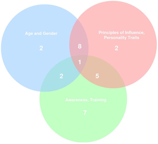 Several studies, including [,,,,,,], appear to address our first research question. However, important considerations remain. For instance, these studies often utilize relatively small sample sizes (ranging from 50 to 150 participants), which may limit the generalization of their findings regarding the influence of demographics and educational background on susceptibility to phishing emails.