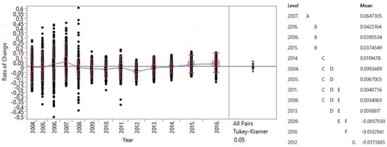 It is important to note that, before conducting a detailed analysis of transport factors, the primary focus was on analyzing the existence of statistically significant differences in the trends of average annual rates of change in road transport demand over the years (the average annual rate of change was used in this research as it provides a clearer long-term trend across years, minimizing the impact of short-term fluctuations and offering a more reliable measure for forecasting transport demand.). For this examination, the Tukey–Kramer test was performed (The Tukey–Kramer test is a multiple comparison test used to identify means that are significantly different []), with a significance level of 0.05. The test revealed a statistically significant difference in the trends of average annual rates of change in road transport demand over the analyzed period (Figure 1). The greatest differences were found in 2007 (6.47%) compared to 2012 (−3.74%).