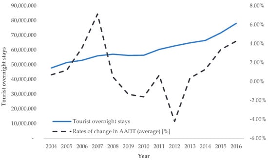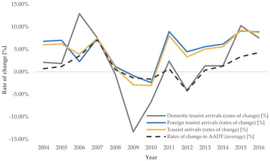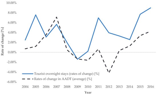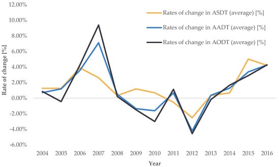 Traffic volume was used to investigate the impact of temporal unevenness on the rates of change in road transport demand intensity, with an analysis of the rates of change in AADT, ASDT, and AODT during the analyzed period. AADT represents the annual average, ASDT represents the tourist season, and AODT represents the period outside the tourist season.
