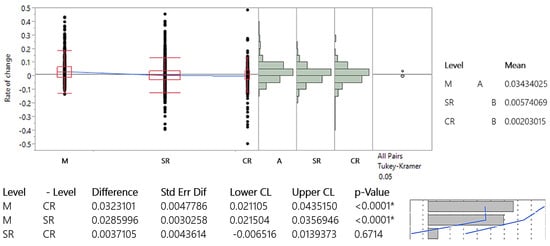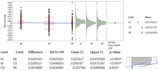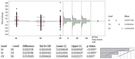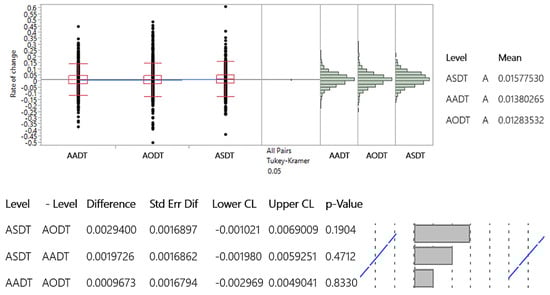 The obtained results comply with the AADT, ASDT, and AODT data, considering the similarity in values between AADT and AODT and the more significant differences in ASDT. The results of the Tukey–Kramer test are shown in Figure 7, Figure 8 and Figure 9.