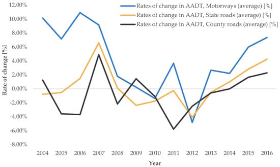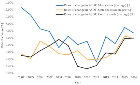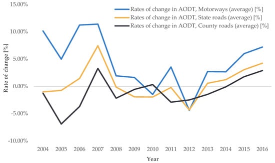The analysis of the traffic counting database revealed that the highest average annual growth rates of change for AADT, ASDT, and AODT were found on motorways, followed by state roads, while a slight average decline was observed on county roads. Accordingly, during the analyzed period, the AADT on motorways increased on average by 4.24% annually, on state roads by only 0.45%, while county roads showed a downward trend of −0.61%. The highest growth was recorded in 2007 (on motorways in 2006), and the largest decline in 2012 (on county roads in 2011). The trends of the average annual rates of change in road transport demand intensity for AADT, ASDT, and AODT by individual road categories are shown in Figure 4, Figure 5 and Figure 6.