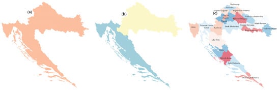 National classification of spatial units of Croatia (a) NUTS-1 (entire Croatia), (b) NUTS-2 (Statistical regions–Continental Croatia and Adriatic Croatia), and (c) NUTS-3 (counties)).