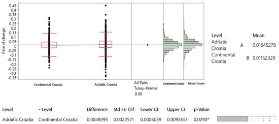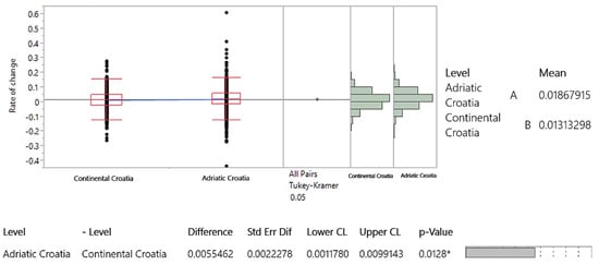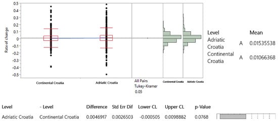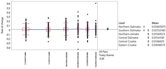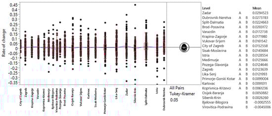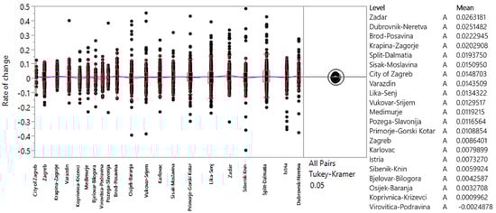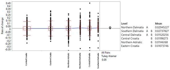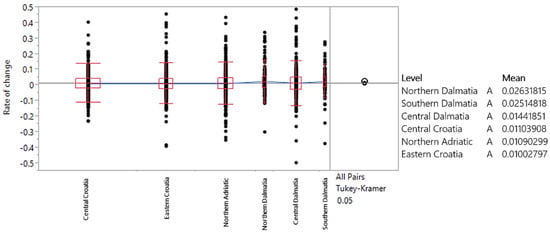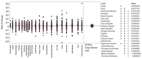 Geographical location was analyzed according to the national classification of spatial units (NUTS-1, NUTS-2, and NUTS-3) []. The use of NUTS 3, NUTS 2, and functional regions allows for a more granular analysis of transport demand, capturing the regional differences that exist between Croatia’s coastal and inland areas. This differentiation is critical, especially given the distinct economic drivers of tourism along the Adriatic coast compared to continental area. National classification of spatial units of Croatia is shown in Figure 10. For the purpose of the analysis, the Tukey–Kramer test was conducted, with the initial assumptions being tested and satisfied. A significance level of 0.05 was used, and the null hypothesis was that there is no statistically significant difference in the movement of average annual rates of change in road transport demand across different spatial units.
