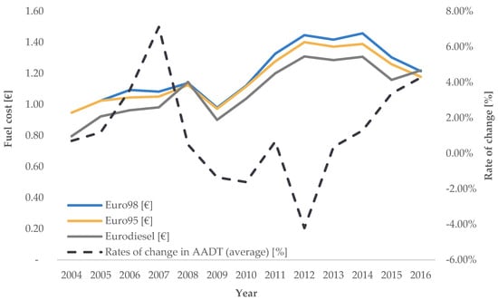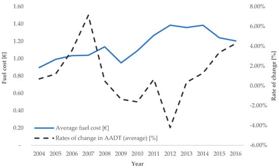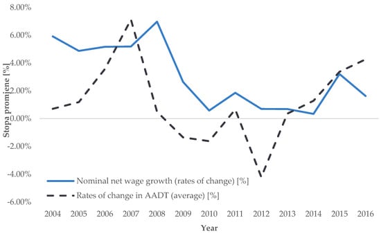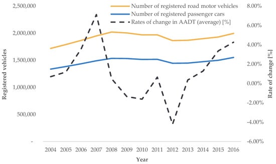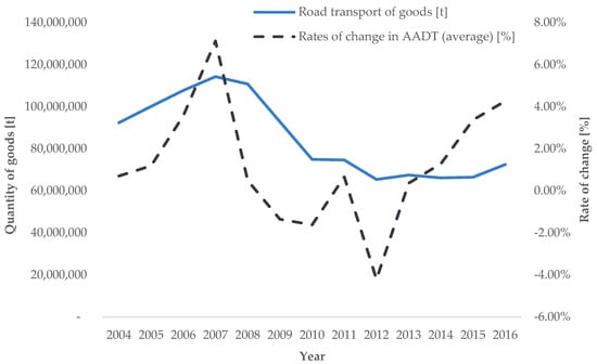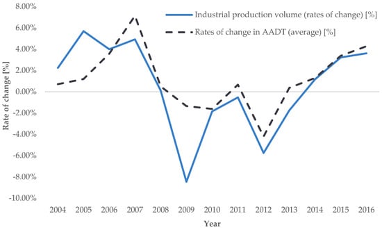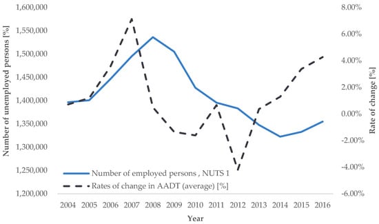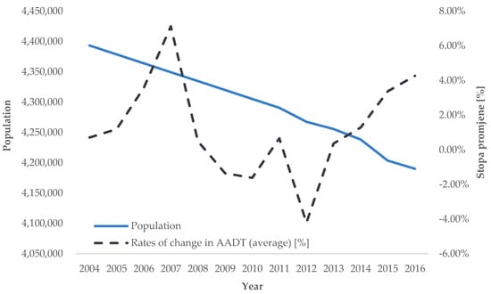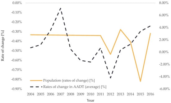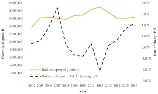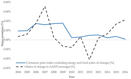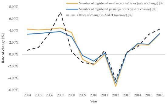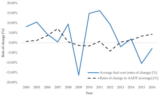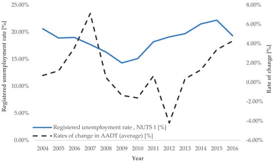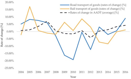 Trend of average annual rates of change in road transport demand intensity for AADT (source: [], authors’ processing).
