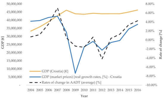 For the analysis, statistical testing of the difference in means of annual rates of change in AADT, ASDT, and AODT was carried out by counties (NUTS 3) and statistical regions (NUTS 2). For the entire Republic of Croatia (NUTS 1), it was found that there is a statistically significant difference in annual rates of change in road transport demand during the analyzed period (see Figure 1). In addition, testing was conducted according to six functional regions, which according to the Transport Development Strategy of the Republic of Croatia for the Period from 2017 to 2030 [] reflect a significant portion of daily migrations in Croatia. During the analysis of spatial units, it was also noted that neither NUTS 3, NUTS 2, nor functional regions represent actual economic and transport functional regions of Croatia but rather administrative boundaries. This is demonstrated by significant differences in development (and consequently, traffic intensity) among counties (e.g., the City of Zagreb and other major cities compared to counties without major cities) as well as within counties themselves (e.g., counties in Adriatic Croatia have economically stronger local government units on the coast than inland, as reflected in the average county GDP).
