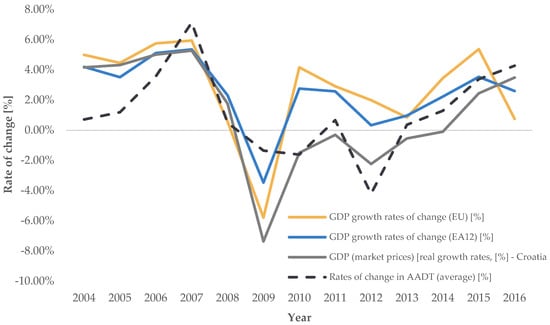 - The trend of average annual changes in road traffic demand intensity shows a statistically significant and positive correlation with the annual changes in GDP growth rates of the Republic of Croatia and the EA12 countries, but not with the GDP of the entire European Union;