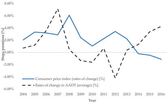 The rates of change in intensity were calculated as annual rates of change compared to the previous year, based on the road traffic counting database maintained by Croatian Roads Ltd. (Zagreb, Croatia) []. Hence, each rate of change was calculated separately for each road traffic counter. The unit of measurement for the rates of change in road transport demand intensity is the percentage.
