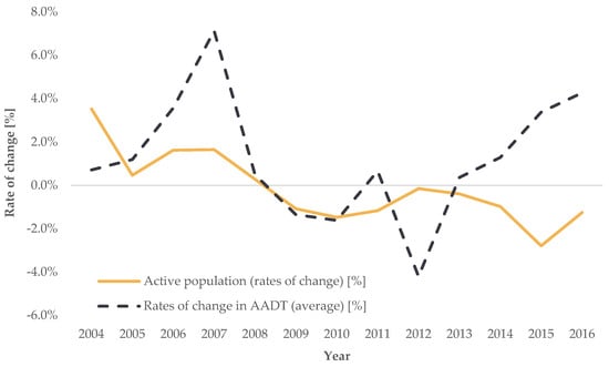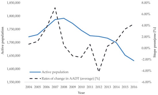 Trend analysis of active population, rate of change (source: [], authors’ processing).