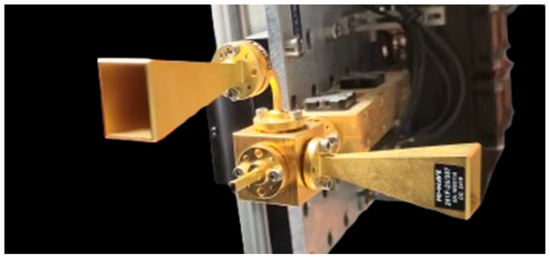 A key component of this setup is the Magic Hybrid Tee (from Mi-Wave, St. Petersburg, FL, USA) as shown in Figure 1, which operates within the W-band frequency range (75–110 GHz). This device comprises three orthogonal flanged waveguide sections that allow for effective signal splitting and phase management. When a signal is applied to the H-plane arm, it divides equally between the two main in-line ports, producing equal-power and in-phase outputs. Conversely, applying a signal through the E-plane arm also splits the signal but results in equal-power outputs with opposite phases, thereby facilitating phase-reversed signals necessary for advanced signal processing. To achieve in-phase transmission in both directions, the source output is connected to the H-port through a straight waveguide, minimizing phase distortions. In our setup, the same standard gain horn antenna is used in both arms to ensure uniformity in signal transmission and reception. This Hybrid Tee ensures low insertion loss (approximately 1.0 dB) and maintains excellent isolation (approximately 20 dB) between the E-plane and H-plane arms, which is crucial for minimizing interference in high-frequency applications. The MMW signal is split into two paths using this device: one directed towards the object and the other serving as a reference, both essential for subsequent range determination.