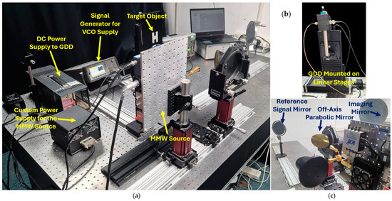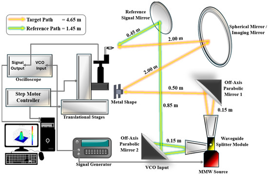 In the target path, the MMW beam is collimated using an off-axis parabolic mirror, allowing for precise illumination of the target object. The radiation reflected from the target object is then projected onto a spherical imaging mirror, which focuses it onto the GDD positioned at the image plane. In the reference path, the signal is directed through an additional collimating mirror and projected onto a small flat mirror, known as the reference signal mirror, to establish a stable reference signal for the GDD, enabling precise range detection. The MMW reflections from both the object and reference paths are directed toward the GDD (N523 from International Light Inc., Yorba Linda, CA, USA), which serves as the central detection component. The GDD is sensitive to variations in discharge current when exposed to incident MMW radiation, providing an electrical detection mechanism for the reflected FMCW signals. This detection is achieved through heterodyne mixing in the GDD, where the incident MMW power induces variations in the discharge current. The frequency-modulated signals are thereby translated into measurable current fluctuations, enabling detection. The effectiveness of the GDD in this application stems from its ability to operate without cryogenic cooling, its robustness to high-power MMW exposure, and its cost-effectiveness compared with conventional MMW detectors [11]. However, given the current resolution limitations, further optimization of the optical setup and detection mechanism is necessary to fully realize its potential in high-precision imaging applications.
