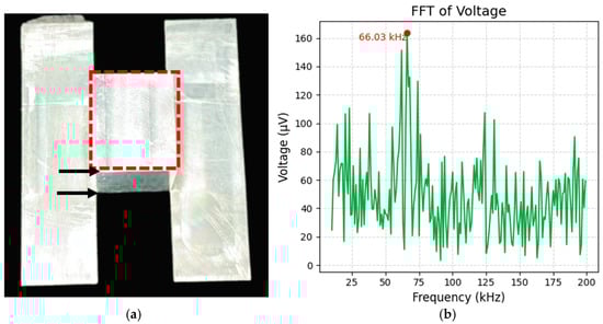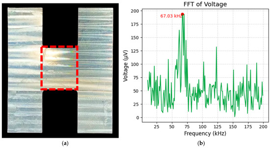 To evaluate the capability of the GDD integrated with FMCW radar in capturing depth information, we conducted an experimental procedure focusing on range differentiation while imaging objects of varying dimensional profiles. By obtaining range data through beat frequency analysis, we sought to establish the potential for creating three-dimensional MMW images using the GDD system. Initially, a flat “H” shape, as described in Section 3 and illustrated in Figure 4, was positioned as the object. Radiation was focused on the central portion of the “H,” marked by a red dotted square in Figure 7a, to emphasize the region of interest. The GDD’s position was adjusted to receive reflected signals specifically from this central section. Raw data collected from the oscilloscope were then processed through FFT analysis to identify the beat frequency. For this configuration, the beat frequency was determined to be 67.03 kHz, as shown in Figure 7b.