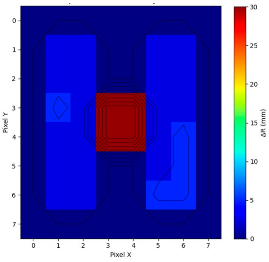 In addition to the grayscale 2D image, a heat map representation as shown in Figure 10 was used to enhance the visual clarity of the range data. The heat map assigns color values to different range measurements, allowing for easier differentiation between depth variations. Warmer colors, including red and orange, represent shorter ranges, while cooler colors like blue and green indicate longer distances. This color-based representation is particularly effective for identifying subtle variations in range, especially when imaging more complex 3D objects. For example, the 3D “H” shape experiment, which involved a central projection of 25 mm, resulted in a 24.1 mm difference in the calculated range, which was clearly captured in the heat map as a distinct shift in color, confirming the sensitivity of the system to depth changes.