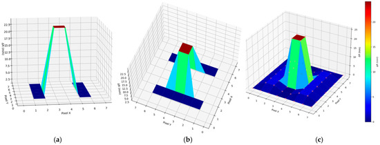 Initially, the FMCW setup enabled the acquisition of an 8 × 8 grayscale image of each shape by capturing voltage levels from the reflected radiation path, which was processed by the GDD detection circuit. Through these experiments, range information was derived by mapping signal variations, which were aligned with the optical path difference (OPD) set in the system. Given the system’s configuration, achieving simultaneous reference and imaging signals across all points in the 8 × 8 grid required strategic mirror positioning for optimal alignment. Due to the limitations in the reference signal’s positioning, each object’s image was captured over multiple scanning positions, with pixel data combined and aligned based on their respective grid locations. The merged pixel data then provided a final 8 × 8 MMW image for each object using FMCW-radar-based imaging, as shown in Figure 6. The asymmetrical “F” shape in Figure 6a is particularly affected by the inherent flipping effect of the optical system, which inverts the image both vertically and horizontally. This effect is less noticeable in symmetrical shapes, like the “O” and “H”, making the flipping more prominent in the “F” shape.