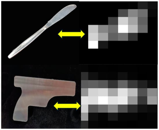 The imaging results for a knife and a gun-shaped object, captured using the current 8 × 8 pixel resolution system, highlight the spatial resolution limitations imposed by the physical configuration of the setup, particularly in accurately representing complex or curved objects. Due to the coarse resolution, the system struggles to capture finer structural details, making it difficult to faithfully reproduce the object’s curved profile. Figure 12 presents grayscale images generated by the MMW imaging system for two objects—a knife and a gun-shaped object—along with photographs of the actual objects for comparison. The MMW images demonstrate the system’s spatial limitations, where the 8 × 8 pixel resolution introduces granularity that affects the accurate depiction of intricate shapes, especially for curved geometries like the knife. To address these limitations, we propose increasing the size of the imaging mirrors, which would reduce the resolution limit. For instance, doubling the mirror size could improve the resolution from 8 mm to 4 mm. However, to maintain compatibility with the improved resolution, smaller GDDs would be required. These enhancements, including the use of smaller GDDs and larger mirrors, would significantly improve the system’s ability to reconstruct complex or curved objects with finer details, thereby enhancing the spatial resolution and overall image clarity in future implementations.