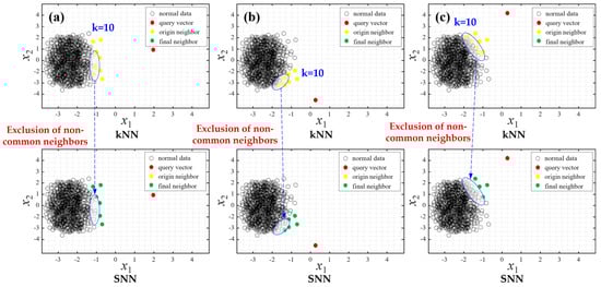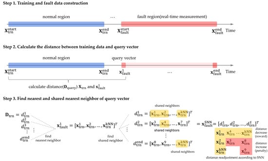 In the field of natural language processing, the attention technique has gained significant focus; this technique increases the weight of the training data that are the most relevant to the given sample [33]. Attention is a method that gives higher weights to important words to dynamically reflect the relationships between words in a sentence. In this paper, inspired by the weighting scheme of attention, we aimed to assign higher weights to training data similar to the fault data when applying distance-based weighting in the data-driven method AAKR. To this end, we used shared nearest neighbor (SNN), which compares the similarity between fault and training data, and rescaled the distance metric based on the number of shared neighbors. The rescaled distances are applied in assigning weights within AAKR to calculate the estimated vector and detection index for fault detection. The advantages of the proposed method are as follows.