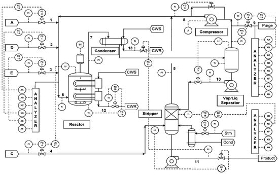 TEP is an industrial process simulation dataset that is widely used in the field of fault detection [38]. These benchmark data are essential because obtaining fault cases from real large-scale processes is challenging. Developed by Eastman Chemical Company, TEP simulates data collected at specific times of failure, closely resembling those of real industrial processes. For patent-related reasons, TEP data are based on simulations of real industrial processes, including their components, dynamics, and operating conditions. The primary equipment of process includes reactors, coolers, and compressors, and the TEP control structure is illustrated in Figure 6.