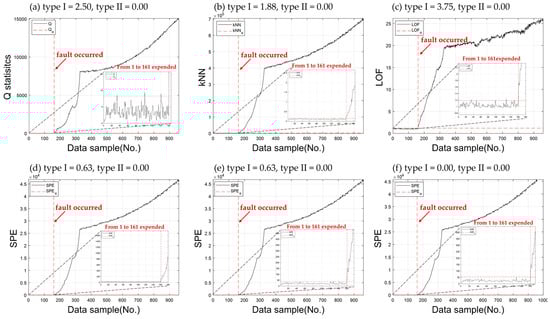 Comparison of fault detection results of conventional and proposed methods: (a–f).
